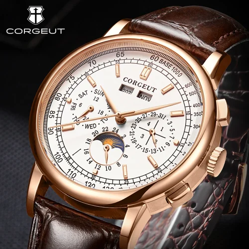 Corgeut 42mm Automatic Men’s Watch Date Day Month Year Rose Gold Dial Multifunction 316L Leather Strap Polished Case Day Night